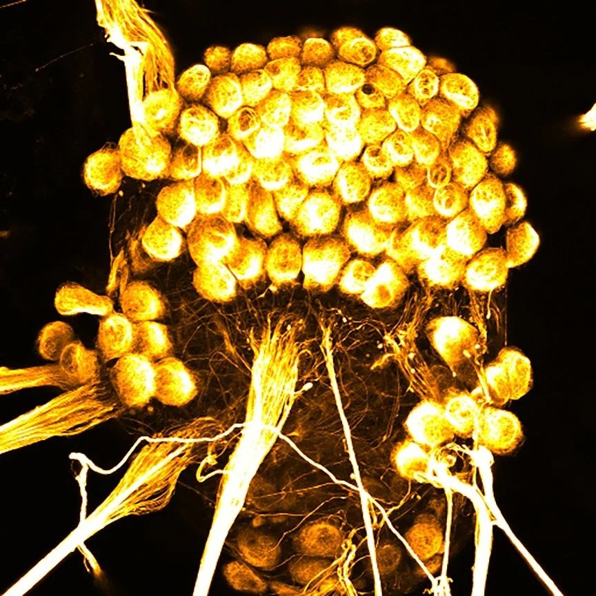This image is a cluster of dorsal root ganglion (DRG) neurons with axon bundles sticking out from it.